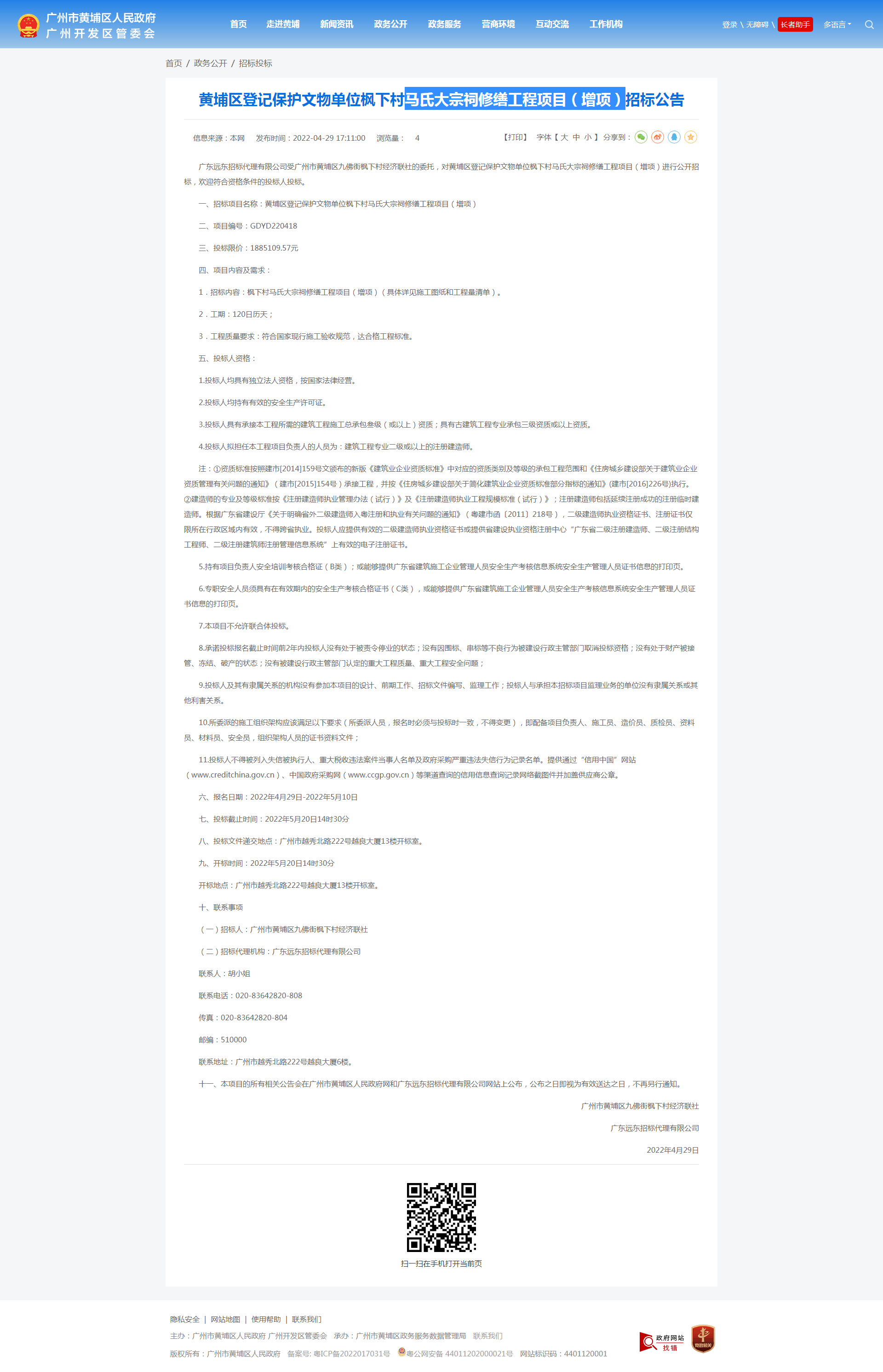 一、招标项目名称:黄埔区登记保护文物单位枫下村马氏大宗祠修缮工程项目(增项)