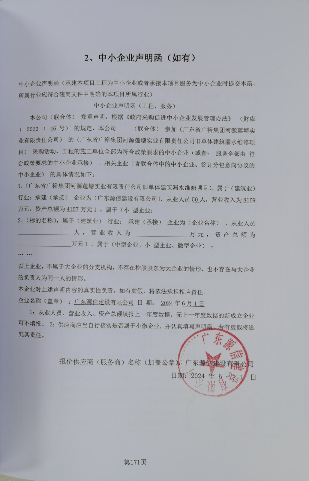 广东省广裕集团河源莲 塘实业有限责任公司旧 单体建筑漏水维修项目 | 符合磋商 文件要求 | 120个日历日 | 刘金源 | 粤2442022202221695 |