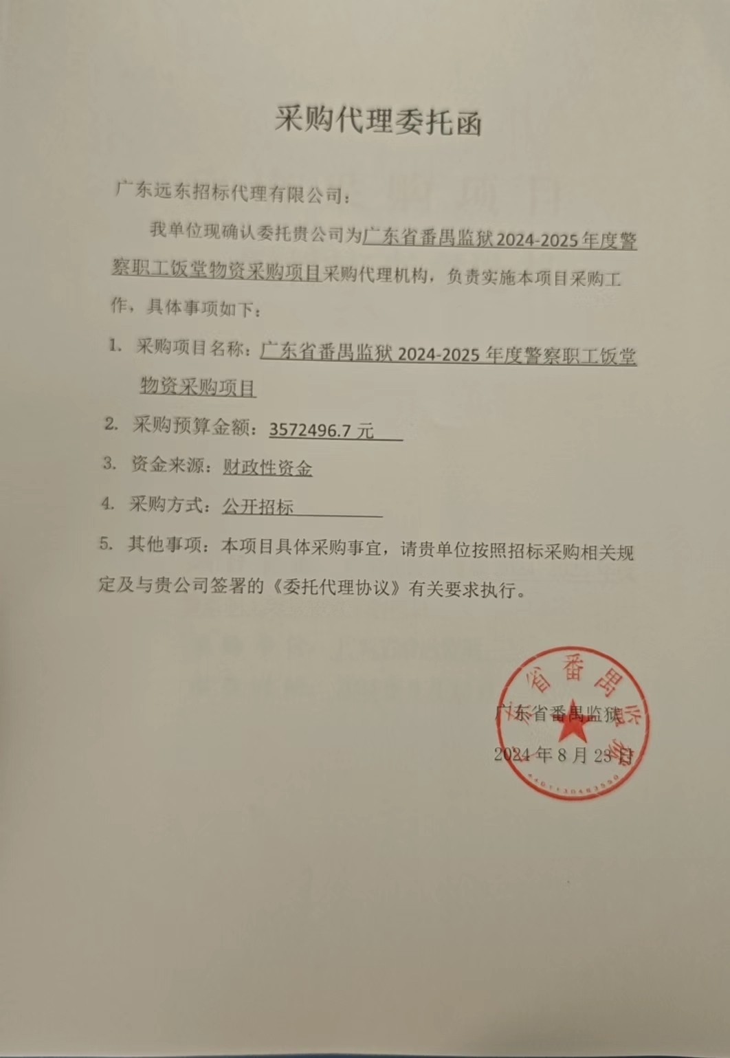 广东省番禺监狱警察职工饭堂2024-2025年度物资采购项目招标项目的潜在投标人应在广东省政府采购网https://gdgpo.czt.gd.gov.cn/获取招标文件,并于 2024年10月21日 09时30分 (北京时间)前递交投标文件。