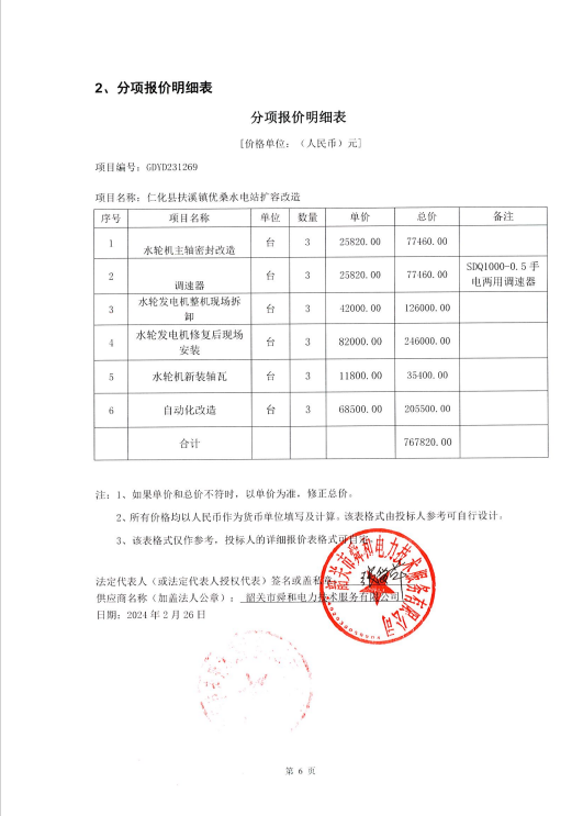1-1 | 仁化县扶溪镇优桑水电站扩容改造 | 详见附件“报价明细表” | 详见附件“报价明细表” | 详见附件“报价明细表” | 详见附件“报价明细表” | ¥767,000.00 |