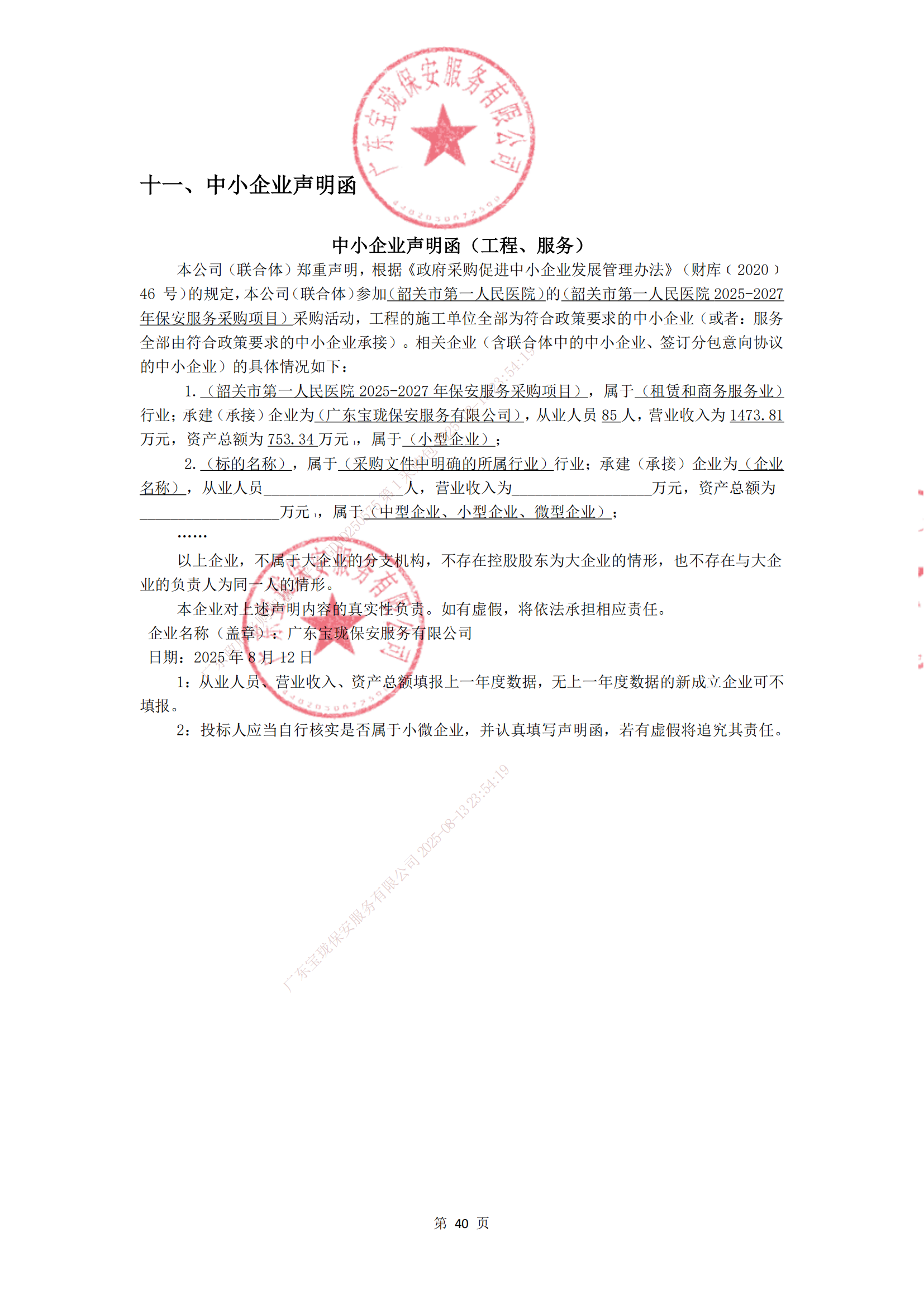 1-1 | 保安服务 | 韶关市第一人民医院2025-2027年保安服务采购项目 | 完全响应招标文件要求 | 完全响应招标文件要求 | 自合同签订之日起2年 | 完全响应招标文件要求 |